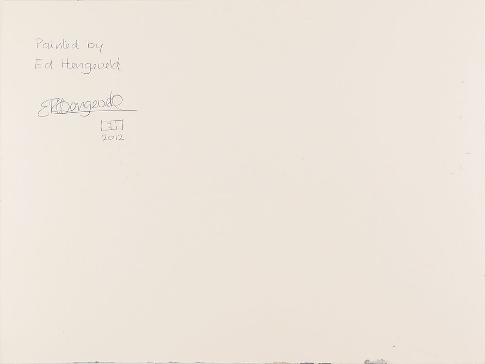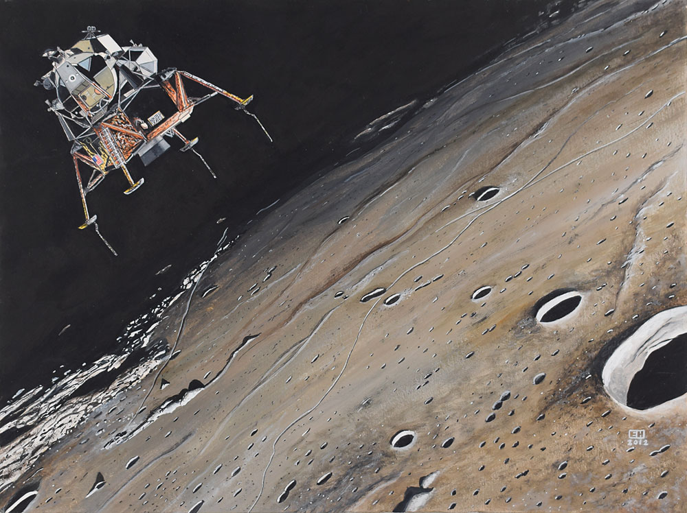 Original color painting by renowned space artist Ed Hengeveld entitled 'Go for PDI,' gouache on paper, 15.75 x 11.75, which depicts an Apollo lunar module preparing to enter Powered Descent Initiation and alight upon the surface of the moon. Signed and dated in the lower right by the artist, "EH 2012," who also signs the reverse in black ballpoint. In very fine condition.