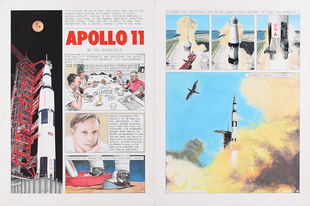 Highly displayable pair of original paintings by space artist Ed Hengeveld for his unfinished graphic novel about the historic Apollo 11 mission, both accomplished in mixed media on 11.75 x 15.75 sheets of artist paper. The first sheet consists of the four-panel title page for the graphic novel, "Apollo 11," which shows images of a Saturn rocket under the moon, the prime crew dining with Deke Slayton, an up-close image of Neil Armstrong, and Armstrong's boot stepping off a lunar module foot; the upper portion reads: "It is 4:30 a.m. on July 16, 1969. On Launch Pad 39A at the Kennedy Space Center in Florida stands a mighty Saturn-5 rocket, waiting in the pre-dawn darkness. Several miles away, in the manned spacecraft operations building (MSOB), three men are up early to make final preparations for a historic journey: a trip to the moon." The second sheet, issued as page No. 6, shows another four panels that comprise the dramatic launch of Apollo 11, with text reading: "A camera with a wide-angle lens on the launch tower captures the first few moments?as Apollo-11 begins its historic flight." In overall very fine condition.