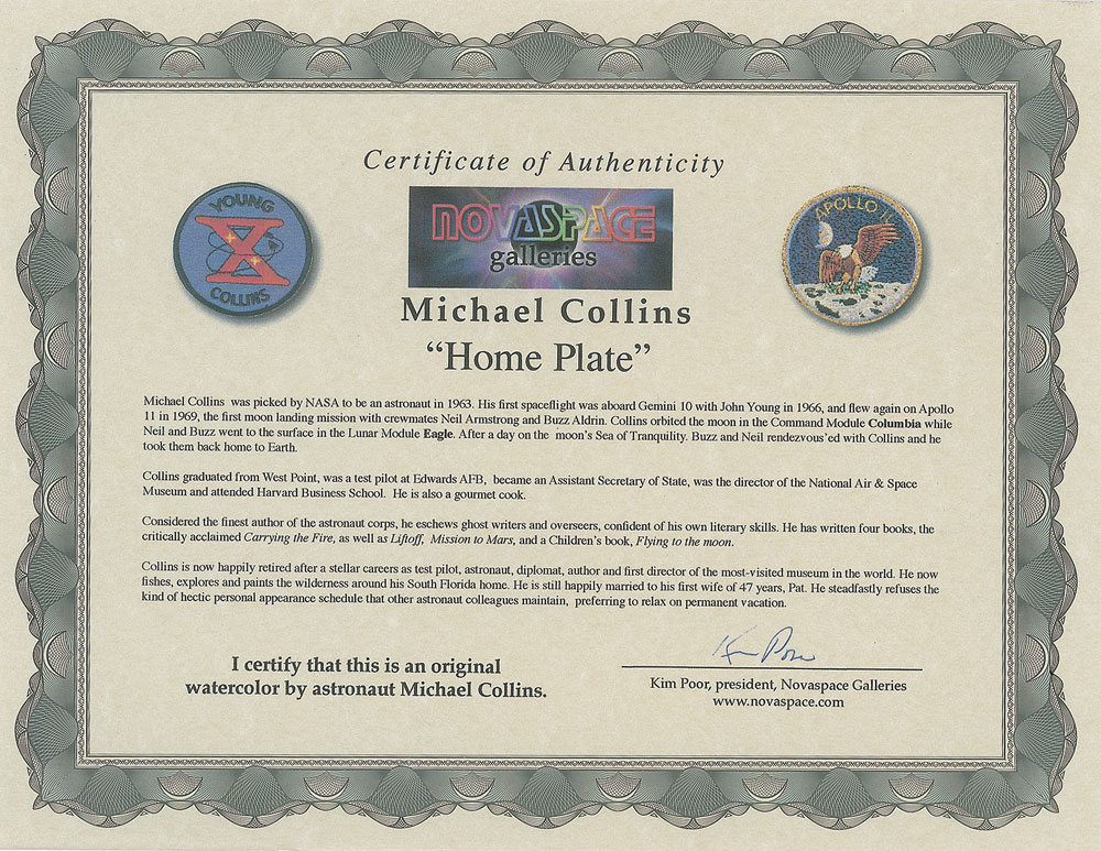 Sought-after original 14.25 x 18 watercolor painting by Apollo 11 astronaut Michael Collins entitled 'Home Plate,' which depicts a United States Air Force jet aircraft soaring over forest and field en route to its base. Signed in black ink, "M. Collins III '05." In fine condition. Accompanied by a certificate of authenticity from Novaspace.