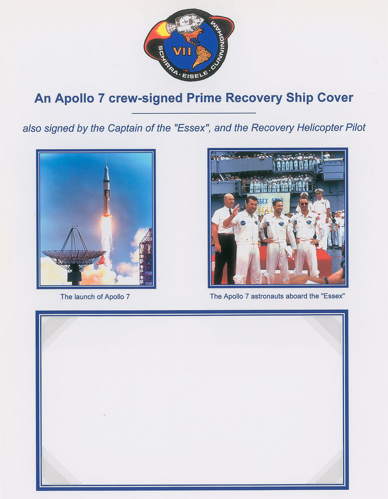 Apollo 7 recovery cover with a stamped cachet honoring the Atlantic U.S. Navy Recovery Force for the Apollo 7 mission, postmarked aboard the USS Essex on October 22, 1968, signed in blue ballpoint, "Donn Eisele," in black ballpoint, "Wally Schirra," and in black ink, "Walt Cunningham." The cover bears a Cunningham autopen signature to left side and is also signed by the captain of the USS Essex and a recovery helicopter pilot. In fine condition.