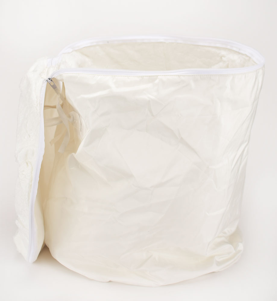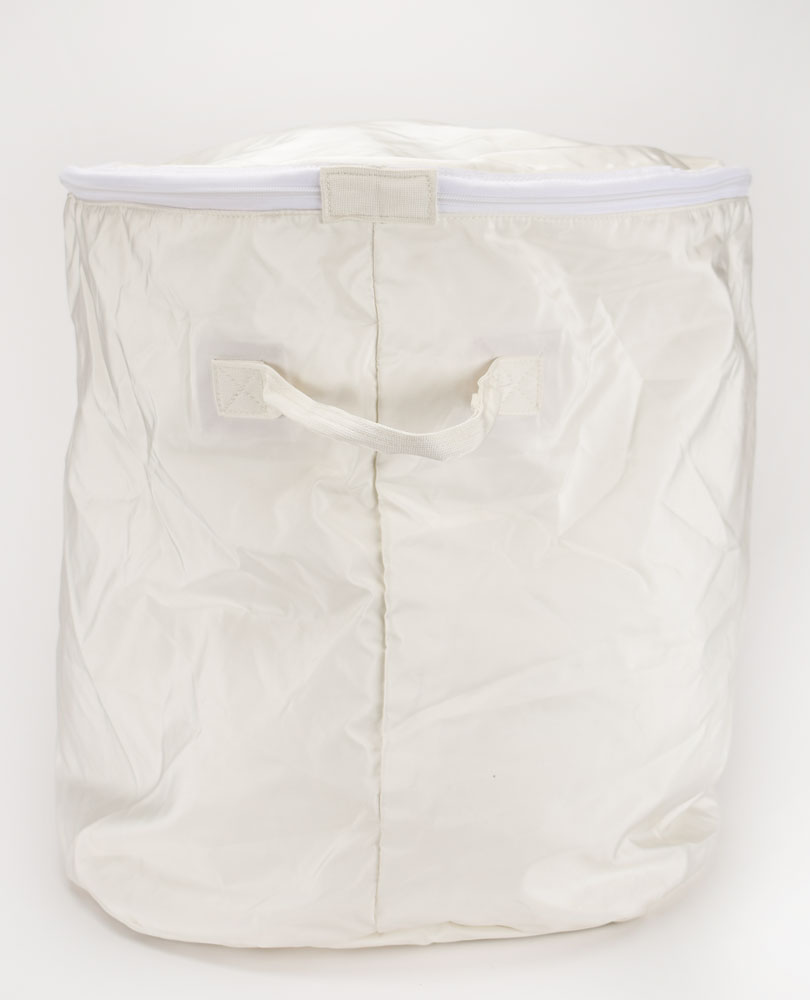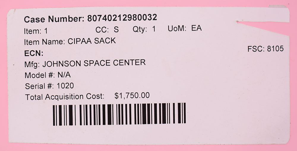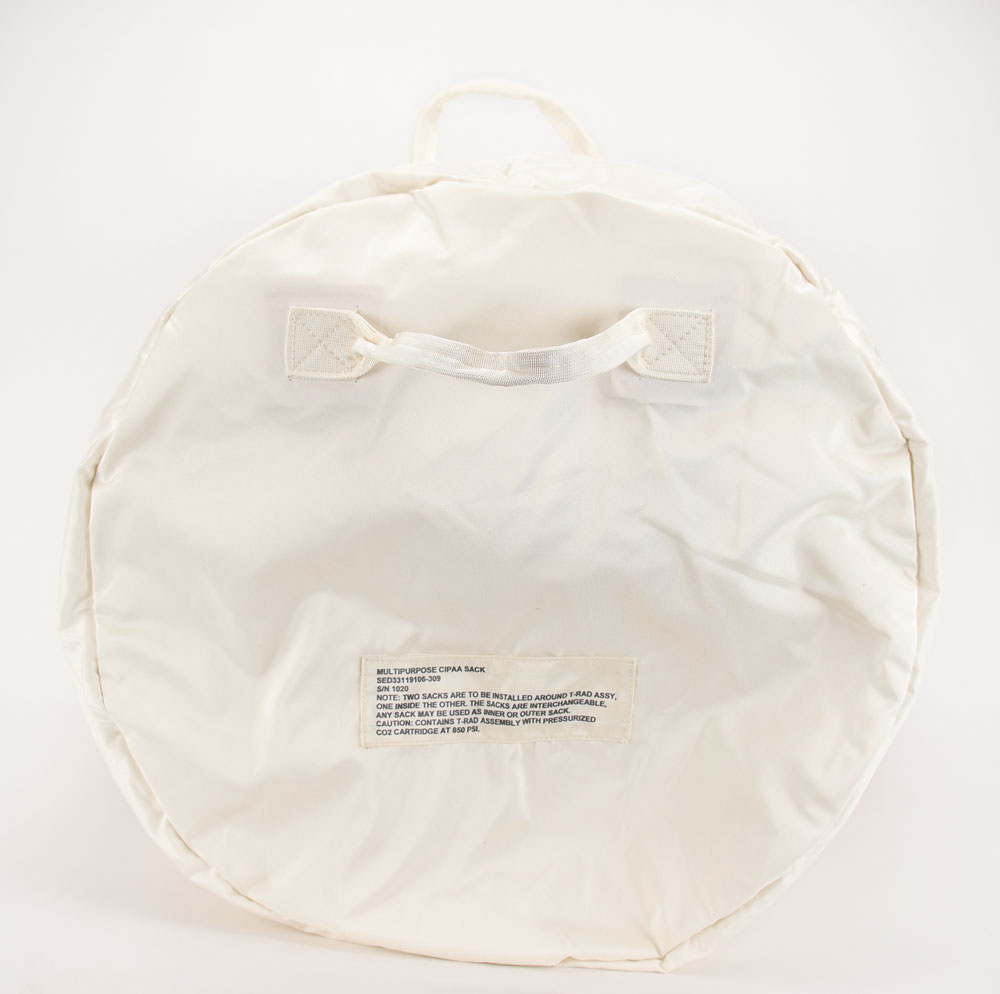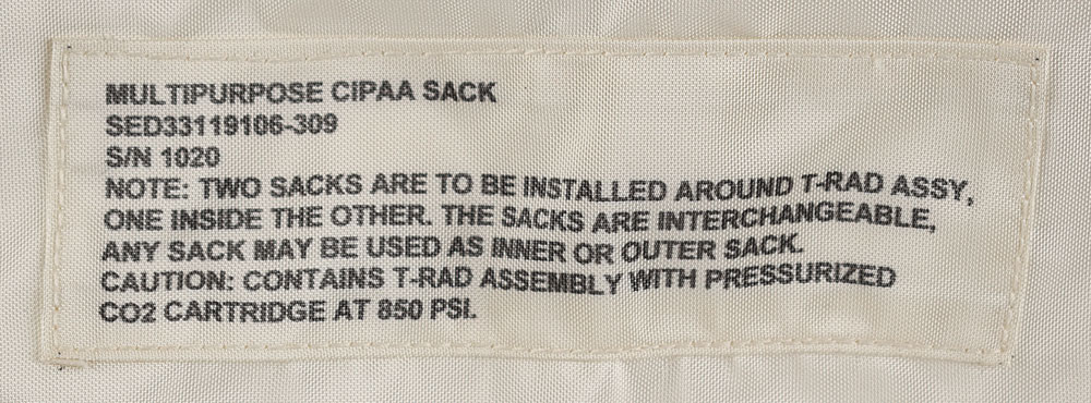 White mulitpurpose Cure In Place Ablator Applicator (CIPAA) sack, measuring approximately 23″ long and 18″ in diameter, with a tag sewn at one end: "Multipurpose CIPAA Sack, SED33119106-309, S/N 1020, Note: Two sacks are to be installed around T-RAD Assy, one inside the other. The sacks are interchangeable, any sack may be used as inner or outer sack." The duffel-style sack is zippered at one end and has two nylon handles. Includes the NASA-JSC cleaning bag with JSC Project Parts tag. In fine condition.