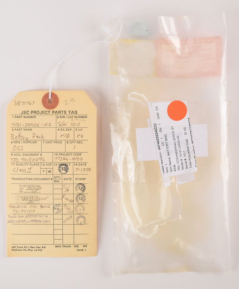 Small insulated battery pouch made for use on the Space Shuttle, measuring approximately 5.5″ tall and 2.5″ in diameter, with an ILC Space Systems tag on the side: "Item: Container, Battery Pack Assembly, Part No. 10181-10037-02, Serial No. 1011?Mfg. 3/92, Contract No. NAS9-17900." Includes the original NASA-JSC cleaning bag and JSC Project Parts tag identifying this piece as "Class I" hardware. In fine condition.