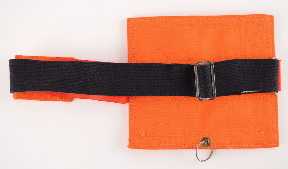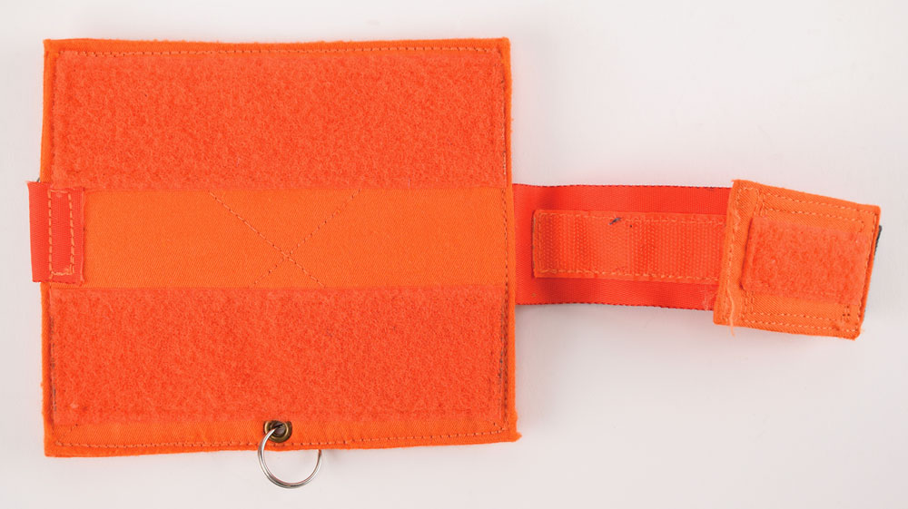 Unlabeled orange Space Shuttle checklist holder assembly, the main panel measuring 6″ x 7″, featuring large orange Velcro tabs and a black elastic band on the back, and a small metal ring on the edge. In fine condition.