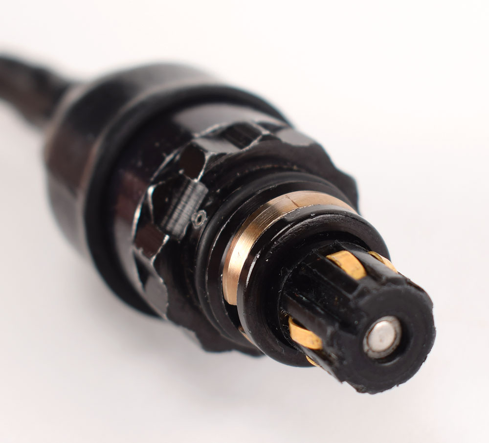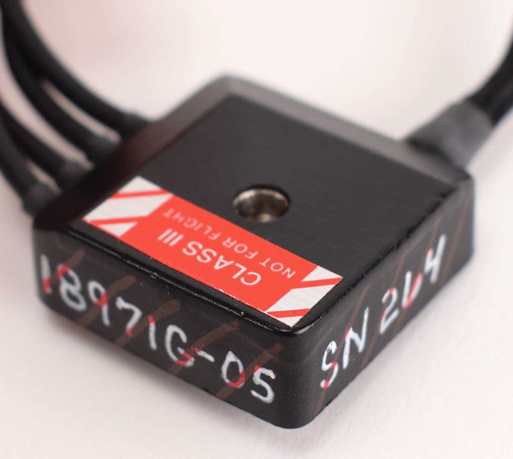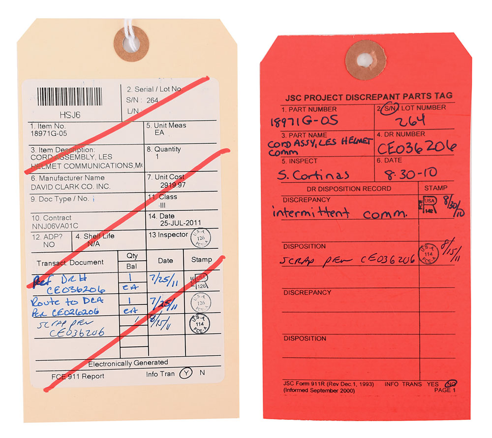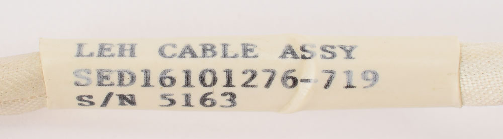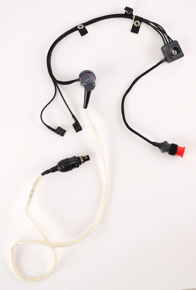 Space Shuttle Launch Entry Suit (LES) helmet communications cord assembly made by the David Clark Company, marked on the white cable, "LEH Cable Assy, SED16101276-719, S/N 5163." Includes its plastic bag with deaccession tag and a red JSC Project Discrepant Parts tag, noting "intermittent comm" as the reason for scrapping the unit. In very good to fine condition.