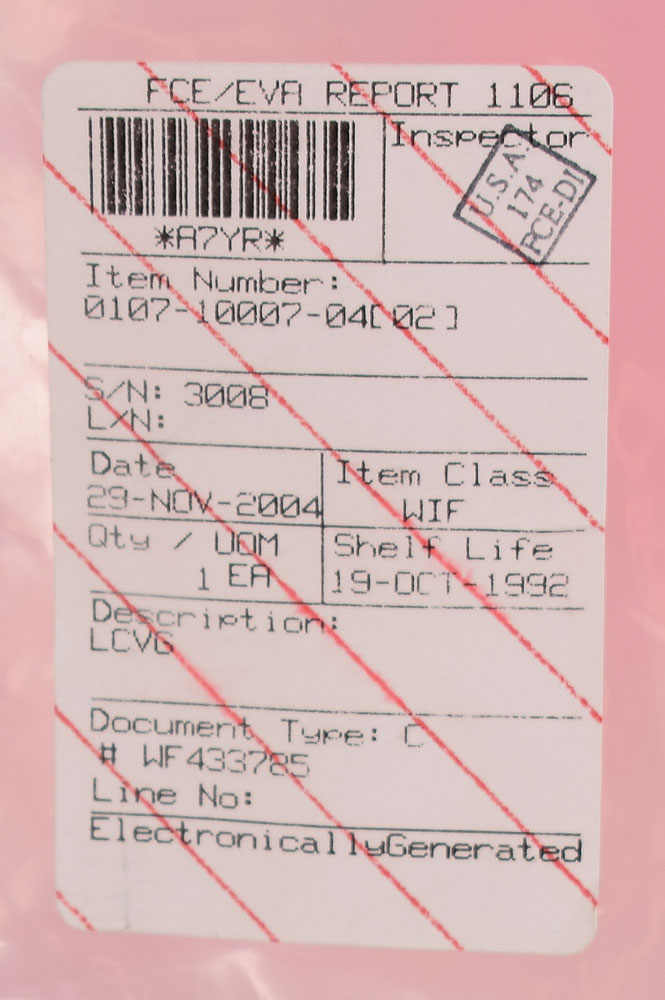 Space Shuttle Liquid Cooled and Ventilation Garment (LCVG), affectionately known as the 'spaghetti suit,' featuring a network of water transport tubing interwoven within the zip-up full-body spandex suit. ILC-Dover manufacturer's tags are sewn inside the collar, reading: "Item: LCVG, Part No. 0107-10007-04, Serial No. 3008, Size: Sml-Sht, Spec. 0107-10007, CEI No. 107?Contract No. NAS9-15150" and "Item: Garment Assy. LCVG, Part No. 0107-84029, Serial No. 30087, Size: 02 Sml-Sht." The crush-resistant ventilation ducts remain intact. Includes its NASA-JSC plastic bag with affixed cleaning label. In very good to fine condition, with some fraying to the fabric.