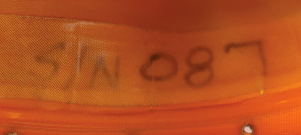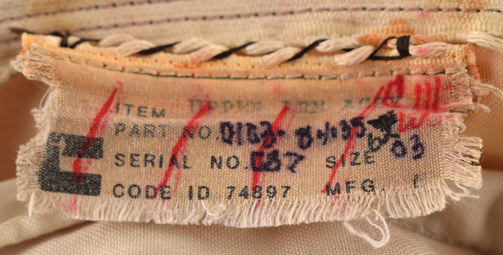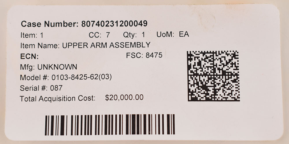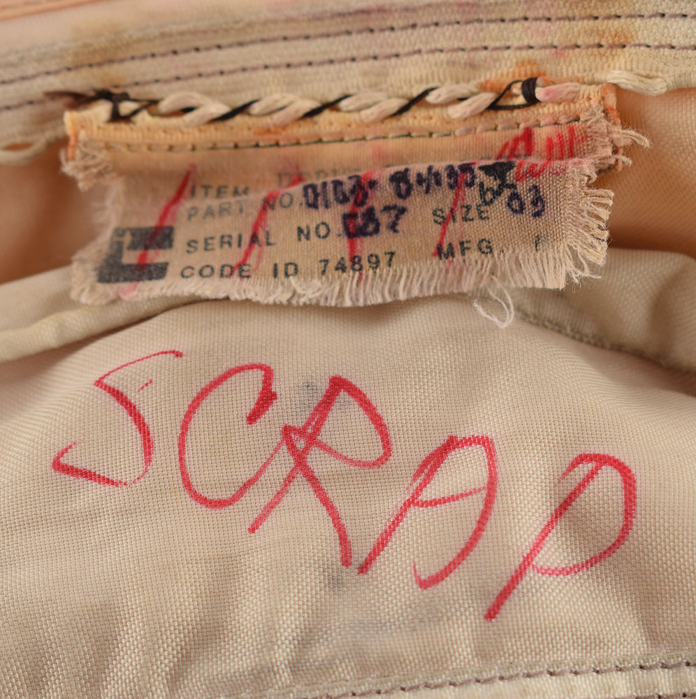 Partial Space Shuttle Extravehicular Mobility Unit (EMU) suit upper arm assembly, with a heavily worn ILC-Dover tag sewn outside the cuff, reading: "Item: Upper Arm Assy, Part No. 0103-84135-6203, Serial No. 087." This scrapped upper arm assembly consists of the inner yellow pressure suit bladder and a single layer of internal white fabric. Includes its plastic bag with deaccession label, noting its acquisition cost as $20,000. In very good to fine condition, with "Scrap" written in red felt tip below the manufacturer's tag.