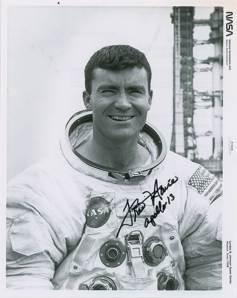 Official glossy 8 x 10 black-numbered NASA photo of Haise in his white space suit, signed in black felt tip, "Fred Haise, Apollo 13." Reverse bears purple NASA caption text and "This paper manufactured by Kodak" watermarks. In fine condition, with a light crease in the top border.