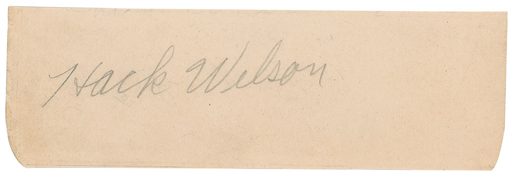 Vintage pencil signature, "Hack Wilson,” on an off-white 4.25 x 1.25 slip. In very good to fine condition, with some light creasing and show-through from label on reverse. Accompanied by a full letter of authenticity from JSA. Pre-certified PSA/DNA and Beckett Authentication.