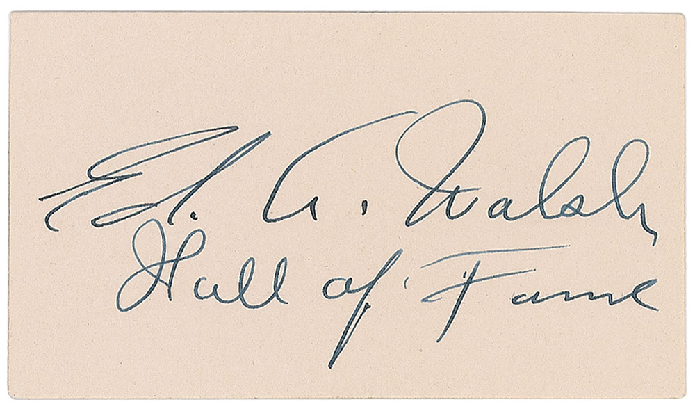 Vintage fountain pen signature, "Ed A. Walsh, Hall of Fame,” on an off-white 3.5 x 2 card. In very fine condition. Pre-certified PSA/DNA and Beckett Authentication.