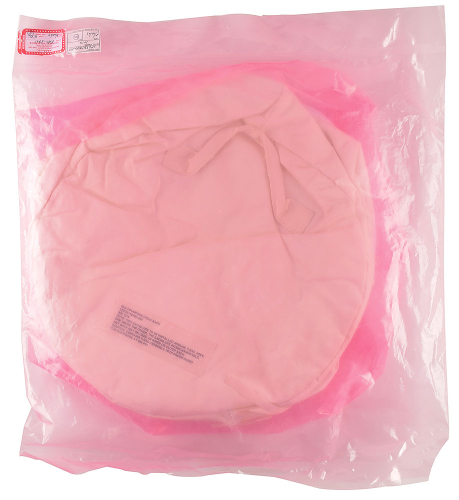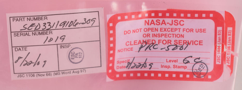 White multipurpose Cure In Place Ablator Applicator (CIPAA) sack, measuring approximately 23″ long and 18″ in diameter, with a tag sewn at one end: "Multipurpose CIPAA Sack, SED33119106-309, S/N 1019, Note: Two sacks are to be installed around T-RAD Assy, one inside the other. The sacks are interchangeable, any sack may be used as inner or outer sack." The duffel-style sack is zippered at one end and has two nylon handles. Sealed in its plastic NASA-JSC cleaning bag with affixed labels. In fine condition.