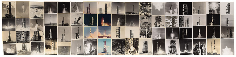 Impressive vintage collection of over 100 early NASA photographs documenting the development and testing of the program’s flagship rocket and missiles launching systems from throughout the 1960s and 1970s. The majority of the photos are glossy black-and-white, with some color and matte-finish, 8 x 10 and 10 x 8, with the greater part of the photos bearing purple caption text on reverse, some notably faded, and others with “A Kodak Paper” watermarks. Images include (some duplicates): dramatic shots of fiery rocket launches for the Saturn 1-B, SA-8, Centaur V, the Atlas-D Antares-2, and Apollo missions 15 and 17, to name but a few; unique glimpses of the interior of the Vehicle Assembly Building, with photos of capsules and staging, such as the S-IV and S-IVB; images of the mobile service structure, including the Launch Umbilical Tower and Crawler-transporter during rollout; various aerial and ground-level perspectives of Launch Complex 39 at the Kennedy Space Center; and NASA personnel and engineers hard at work. In overall fine condition, with some curling to photos, and occasional instances of edgewear. From the M. Edward Thomas Collection.