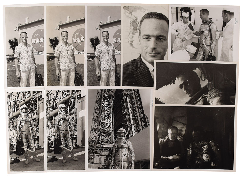 Group lot of 10 vintage original NASA photographs of Aurora 7 astronaut Scott Carpenter, each glossy finished, ranging in size from 10 x 8 to 8.5 x 10, with seven photos of the 'numbered' variety and four bearing NASA caption text on reverse. Images include (contains duplicates): Carpenter standing in his Mercury space suit and holding his portable ventilation unit (3); Carpenter in informal attire posing in front of the NASA sign (3); a close-up portrait of Carpenter with Mercury pin on his lapel; Carpenter in his space suit and surrounded by McDonnell technicians; and two images of Carpenter following his oceanic recovery on May 24, 1962. In overall very good to fine condition, with some notable edgewear. From the M. Edward Thomas Collection.