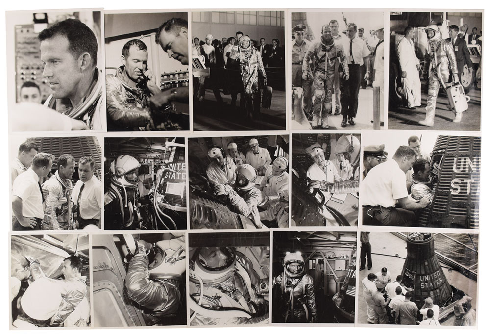 Appealing group lot of 15 vintage original NASA photographs of Mercury astronaut Gordon Cooper before and after his successful Faith 7 flight, all glossy finished, 8 x 10 and 10 x 8, with reverse of each bearing NASA caption text. In overall very good to fine condition, with a few creases and slight edgewear. From the M. Edward Thomas Collection.