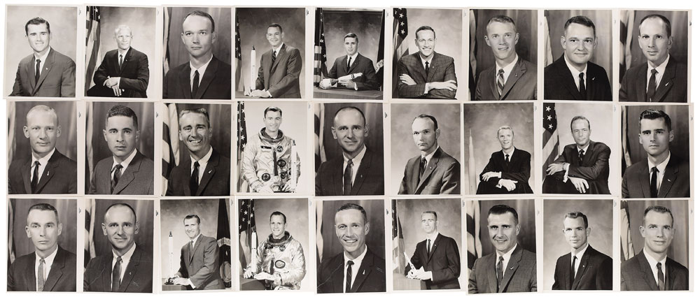 Impressive collection of 27 vintage official NASA portrait photographs of 16 legendary astronauts, all glossy 8 x 10 numbered examples, with each bearing NASA caption text on reverse. Astronauts include: Buzz Aldrin (2), Bill Anders (2), Alan Bean (2), Scott Carpenter, Gene Cernan, Roger Chaffee (2), Michael Collins (2), Walt Cunningham (2), Donn Eisele (2), Theodore Freeman, Richard Gordon (2), Rusty Schweickart (2), Dave Scott (2), Ed White II, Clifton Williams (2), and John Young. In overall very good to fine condition, with some slight curling and edgewear. From the M. Edward Thomas Collection.
