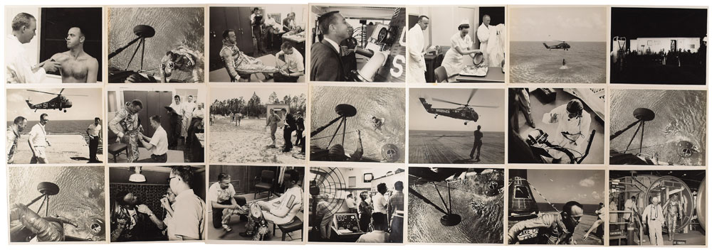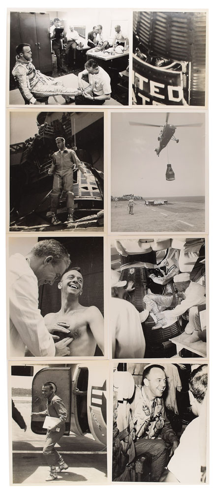 Notable collection of 30 vintage original NASA photographs documenting Mercury astronaut Alan Shepard before and after his historic Freedom 7 flight, each glossy finished, 8 x 10 and 10 x 8, with the majority bearing NASA caption text and stamps on reverse. The group lot features images of Shepard during various pre- and -post-flight events, including medical examination, training, space suit fitting, and splashdown recovery. In overall fine condition, with some wear to edges. From the M. Edward Thomas Collection.