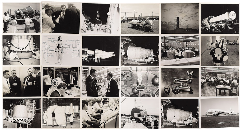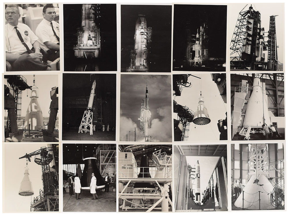 Collection of 41 vintage original NASA photographs of Gemini spacecraft and launch systems, each glossy finished, 8 x 10 and 10 x 8, with the majority bearing NASA caption text and stamps on reverse. The group lot features a variety of different images, most notably of hardware, personnel, and spacecraft, as well as: a sunrise view of the Gemini 2 spacecraft at Cape Kennedy; Gemini spacecraft No. 13 being hoisted on Pad 19; the Gemini-Titan 4 spacecraft being transported after recovery; the arrival of the Gemini 3 capsule at Cape Kennedy; a Saturn SA-7 rocket in gantry with arms pulled back; a Gemini capsule during fit check and dummy stand check; and an overall view of the stripping procedure on a Gemini rocket motor. In overall fine condition, with light creasing and wear to edges. From the M. Edward Thomas Collection.