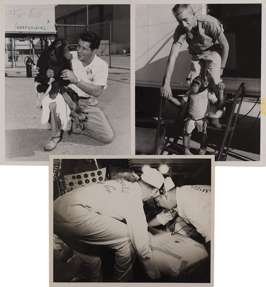 Three vintage original glossy NASA photographs, 8 x 10 and 10 x 8, with two showing Ham the chimpanzee posing with his trainer and another gentleman, and a photo of two technicians inserting the pressure couch designed to carry Enos the chimpanzee into the Mercury spacecraft. Reverse of two photos bear NASA caption text, and one Ham photo inscribed in blue ballpoint. In overall fine condition, with a tape-repaired tear to one photo. From the M. Edward Thomas Collection.
