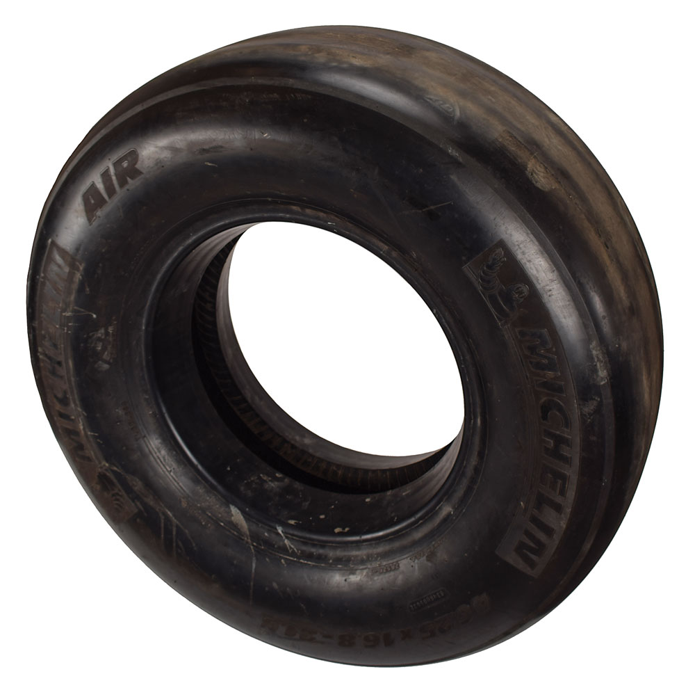 Huge Space Shuttle Orbiter tire manufactured by Michelin, measuring approximately 42″ in diameter and 15″ wide, marked on the sidewall: "Michelin Air, Cage Code OA1K8 44PR, Made in USA, 26526-1, NSN 2620, Tubeless, 6346U09032, 46.25x16.8-21.5." In fine condition, with worn tread and expected wear. Michelin took over as the sole supplier for Space Shuttle tires in 1989 when the company purchased BFGoodrich, which had manufactured the tires since the first Shuttle launch in 1981. Michelin continued to improve upon the BFGoodrich design, and the first set of Michelin Air tires were used in 1995.