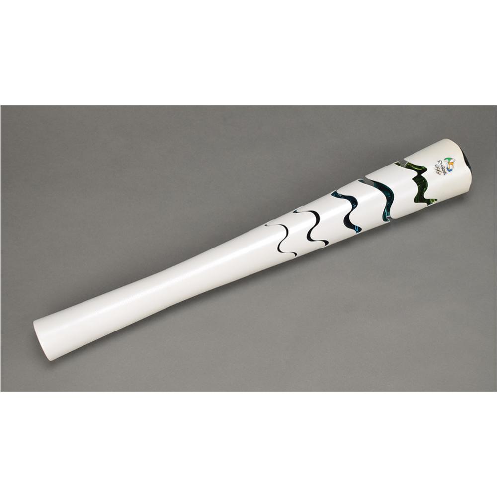 Official 2016 Rio de Janeiro Summer Olympics torch used during the Olympic relay, constructed of recycled aluminum and colored resin, measuring 27″ in length and 3.5″ at its widest point, designed by Sao Paulo studio Chelles & Hayashi and manufactured by Recam Laser. The torch features a white body that automatically expands upon being lit to reveal multicolored segments drawn from the hues of the Brazilian flag, representing the natural wonders surrounding the host city. The Rio Olympic emblem also adorns the top. Includes the original brown drawstring carrying bag and tube.