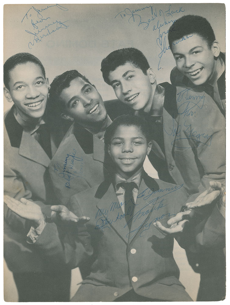 African-American singing sensations of the 1950s who became one of the most popular acts in the fledgling years of rock and roll as a result of such hits as 'Why Do Fools Fall in Love?' and 'I'm Not a Juvenile Delinquent.' The 13-year-old lead singer, Frankie Lymon, became one of the first black teen idols, and, at the height of the group's success, struck out on his own to pursue a solo career. He never matched his earlier success and, after years of grappling with drug addiction, died of an overdose at the age of twenty-five. Terrific and extremely rare 9 x 12 paperstock Alan Freed tour program photo, signed and inscribed in ballpoint, "My man Jimmy, stay kool! Frankie Lymon"; "To Jimmy from Jimmy Merchant"; "To Jimmy, Best of luck always, from Sherman"; To Jimmy from Joe Gregory"; and "To Jimmy, Best wishes, Herman." Signed photos of Lymon, let alone examples of this size, in this condition, and signed by the entire group, are extremely elusive. In fine condition, with Herman's signature rather light (yet legible) as a result of a faulty pen.