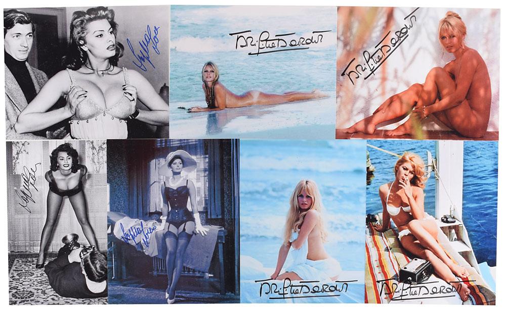 Sultry set of seven glossy photos of Sophia Loren and Brigitte Bardot in various seductive poses, 8 x 10 and 10 x 8, each signed in blue or black felt tip. In overall fine condition.