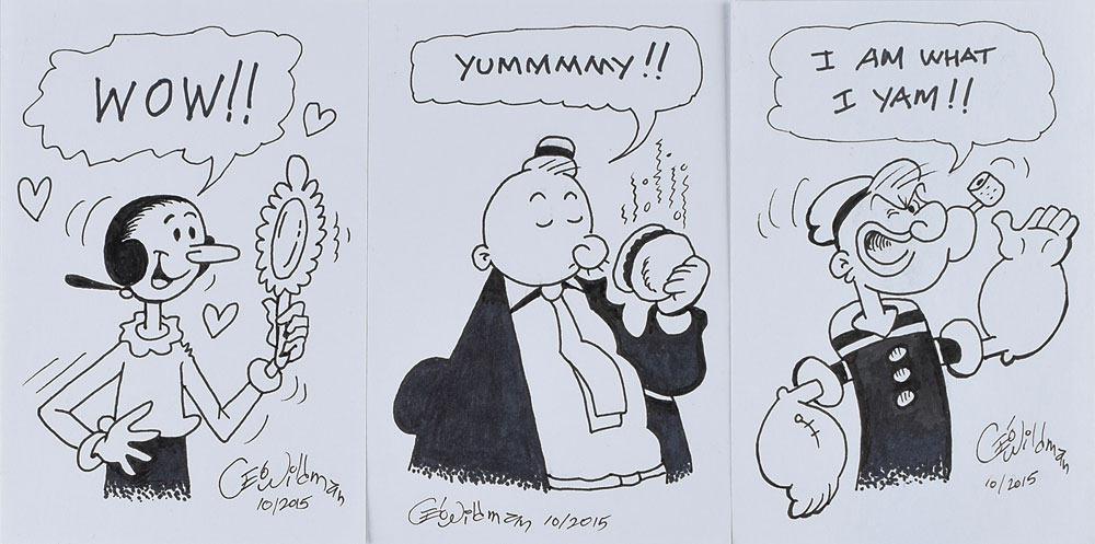 Fantastic set of three original sketches by George Wildman of main characters from the Popeye comic strip, each accomplished in ink on white 4 x 6 sheets, with Wildman signing and dating below each sketch, "Geo. Wildman, 10/2015," and adding a speech bubble to each character, including: Popeye (“I yam what I yam!!”), Olive Oyl (“Wow!!”), and Wimpy (“Yummy!!”). In overall fine condition.