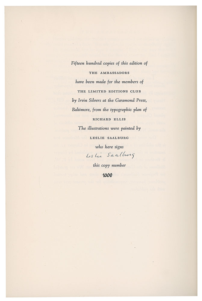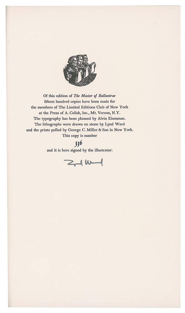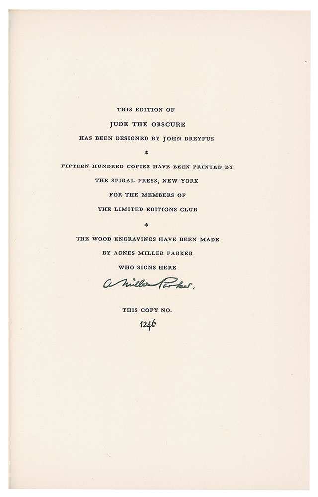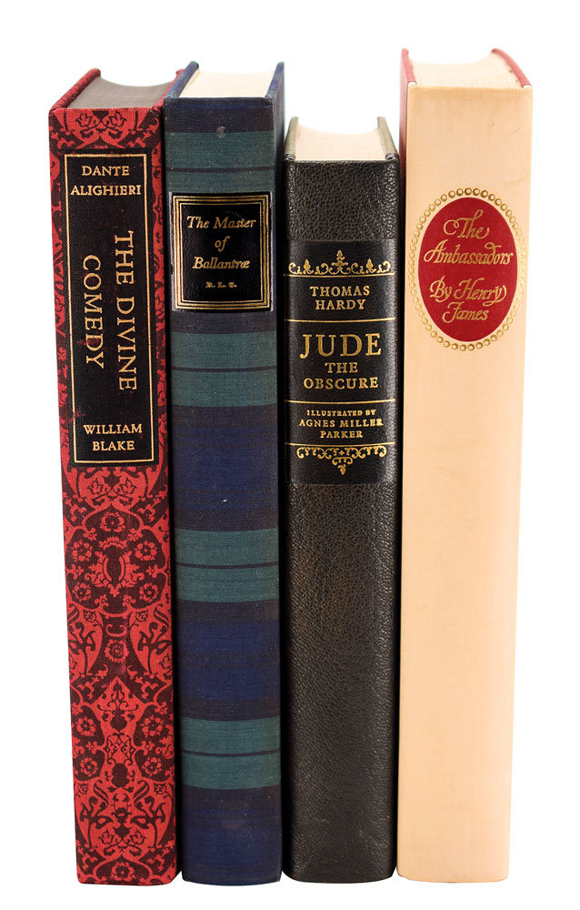 Three slipcased hardcover books published by the Limited Editions Club, each signed on the colophon by the illustrator: The Baster of Ballantrae by Robert Louis Stevenson, numbered 336/1500, signed by Lynd Ward; Jude the Obscure by Thomas Hardy, numbered 1246/1500, signed by Agnes Miller Parker; and The Ambassadors by Henry James, numbered 1000/1500, signed by Leslie Saalburg. In overall very good to fine condition, with some edge splitting to slipcases. Accompanied by an unsigned edition of The Divine Comedy of Dante Alighieri with engravings by William Blake, published by The Heritage Press in 1944.