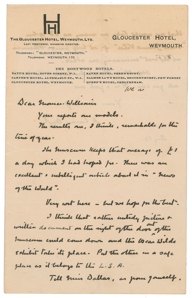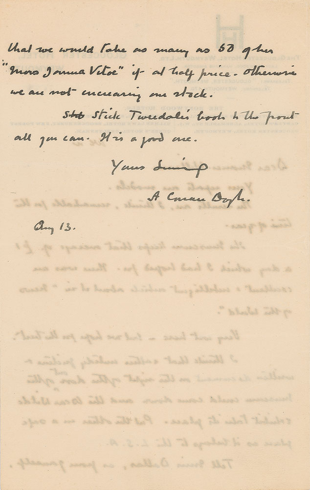 ALS signed “A. Conan Doyle,” one page both sides, 5 x 8, Gloucester Hotel letterhead, August 13. Letter to Frances Williams, in part: "Your reports are models. The results are, I think, remarkable for this time of year. The Museum keeps that average of £1 a day which I had hoped for. There was an excellent & intelligent article about it in 'News of the World.' Very wet here—but we hope for the best. I think that rather untidy picture & written document on the right of the door out of the Museum could come down and the Oscar Wilde exhibit take its place. Put the other in a safe place as it belongs to the L.S.A. Tell Miss Dallas, as from yourself, that we would take as many as 50 of her 'Mors Janua Vitae' if at half price. Otherwise we are not increasing our stock. Stock Tweedale's book to the front all you can. It is a good one." In fine condition.