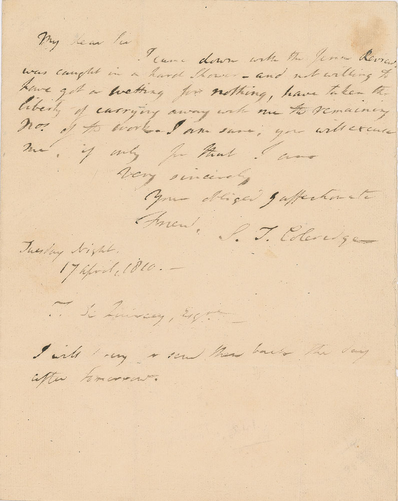 English poet (1772-1834) best remembered for 'The Rime of the Ancient Mariner' and 'Kubla Khan.' ALS signed “S. T. Coleridge,” one page, 7.25 x 9.25, April 17, 1810. Letter to essayist Thomas De Quincy, remembered for his Confessions of an English Opium-Eater. In part: "I came down with the Jena Review, was caught in a hard shower—and not willing to have got a wetting for nothing, have taken the liberty of carrying away with me the remaining Nos. of the work." In fine condition, with a light stain to the upper right corner. Published in the Collected Letters of Samuel Taylor Coleridge, edited by Earl L. Griggs, published by the Oxford University Press. A desirable association between prominent 19th century English writers.