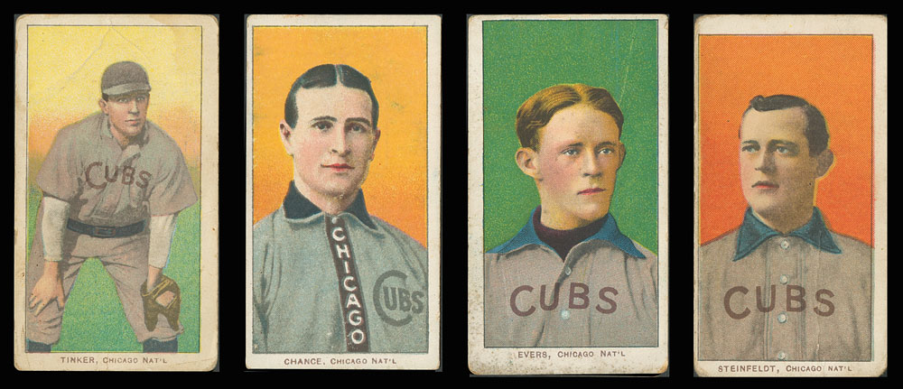 The most famous trio in baseball history, Tinker to Evers to Chance, are represented with each of their T206 cards. Also included is a card of the fourth member of the most famous infield, Harry Steinfeldt.