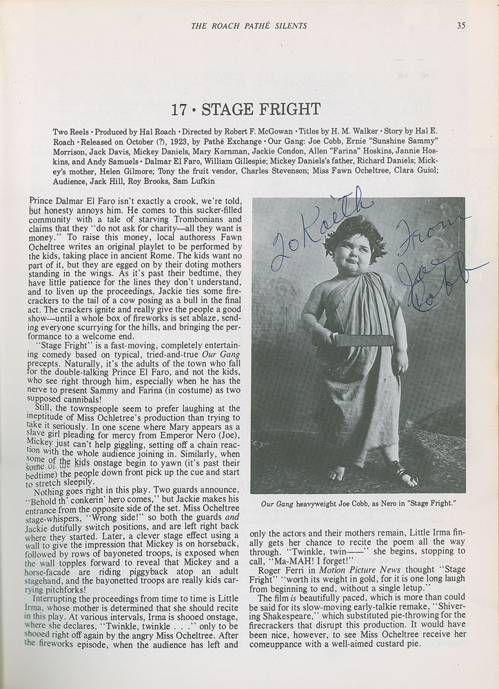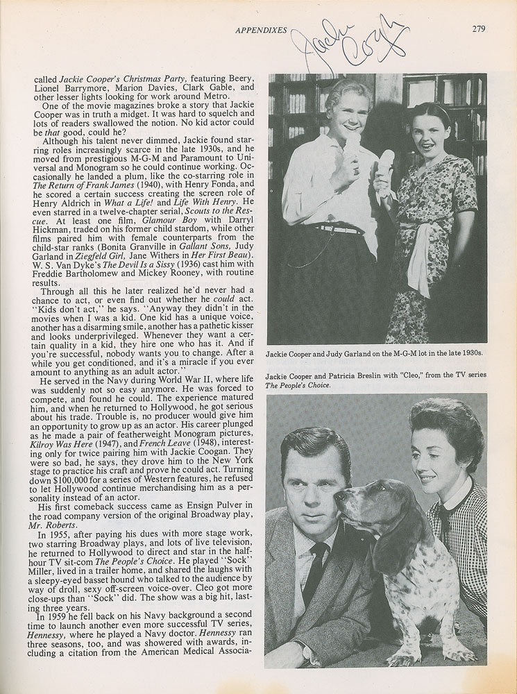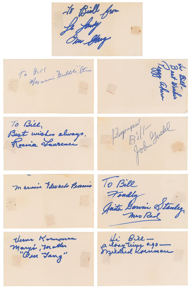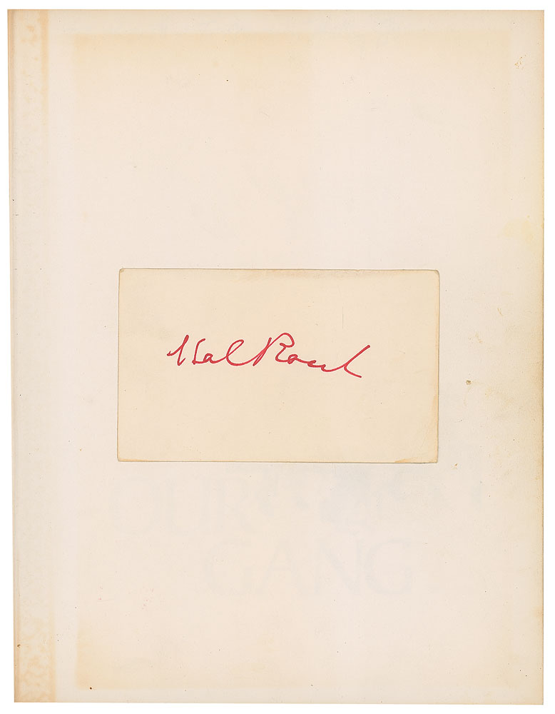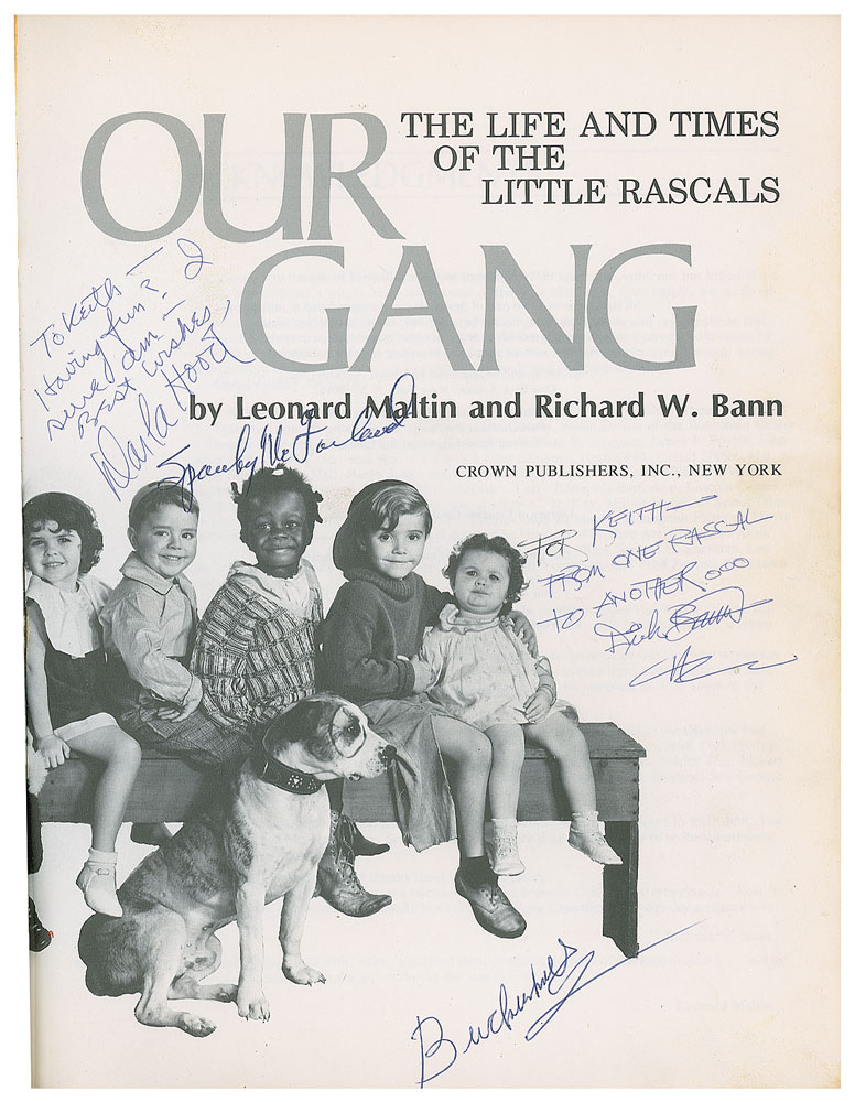 Signed book: Our Gang: The Life and Times of the Little Rascals. NY: Crown Publishers, 1977. Hardcover, 8.5 x 11, 288 pages. Signed and inscribed on the title page in blue ballpoint, "To Keith—Having fun? I sure am—Best wishes, Darla Hood," "For Keith—From one rascal to another? Dick Bann," "Spanky McFarland," and "Buckwheat." A card signed by Hal Roach is affixed to the first free end page, and nine cards—individually signed and inscribed by Peggy Ahern, Marvin 'Bubbles' Trin, John Guedel, Rosina Lawrence, Anita Garvin Stanley, Marianne Edwards, Mildred Kornman, Verna Kornman, and Leonard Landy—are loosely laid in. Also signed inside by Jack Davis, Joe Cobb, Dorothy De Borba, Bobby DeWar, Marvin 'Bubbles' Trin, Rosina Lawrence, Robert Blake, and Jackie Cooper. In very good to fine condition, with wear to the covers, cracking to the front hinge, and old tape stains to the back pastedown and facing page where index cards were once affixed.
