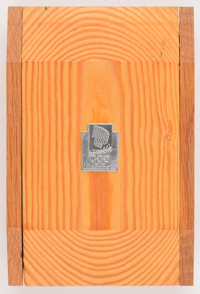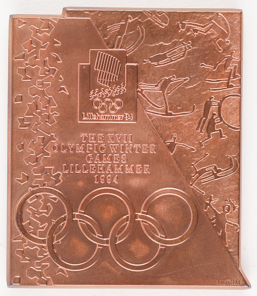 Participation medal issued for the Lillehammer 1994 Winter Olympics. Copper, 66 mm x 76 mm, 223 gm, by Morten Kleppan. The front depicts the Lillehammer Games emblem and rings set between ice crystals and pictograms of sporting events, with raised text, “The XVII Olympic Winter Games Lillehammer 1994”; the reverse bears various sports pictograms and the ice crystal design. Complete with its impressive original wooden presentation box.