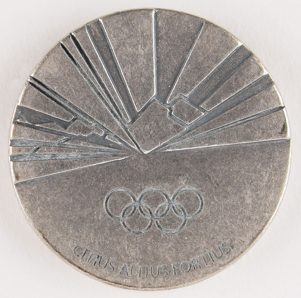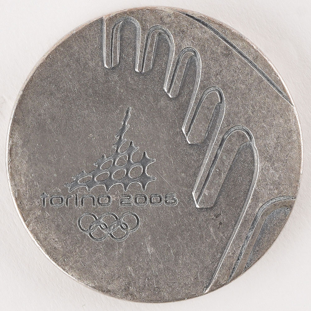 Participation medal issued for the Torino 2006 Winter Olympics. Pewter, 40 mm, 33 gm, by Quatrini. The front depicts the Torino Games emblem with the Aqueduct of Alpignano above; the reverse bears several rays of ice crystals and the Olympic rings and motto below. Complete with its original cardboard and plastic case.