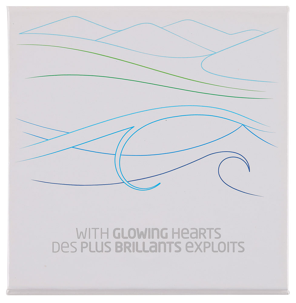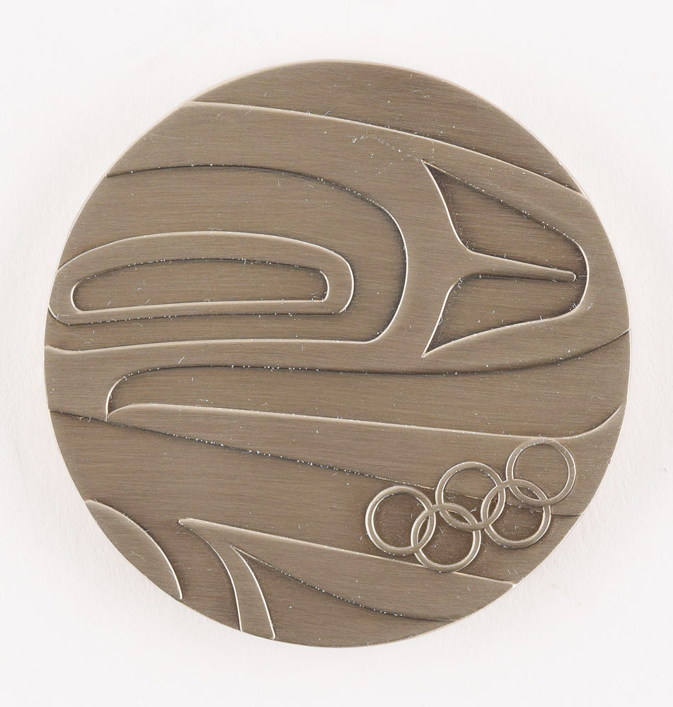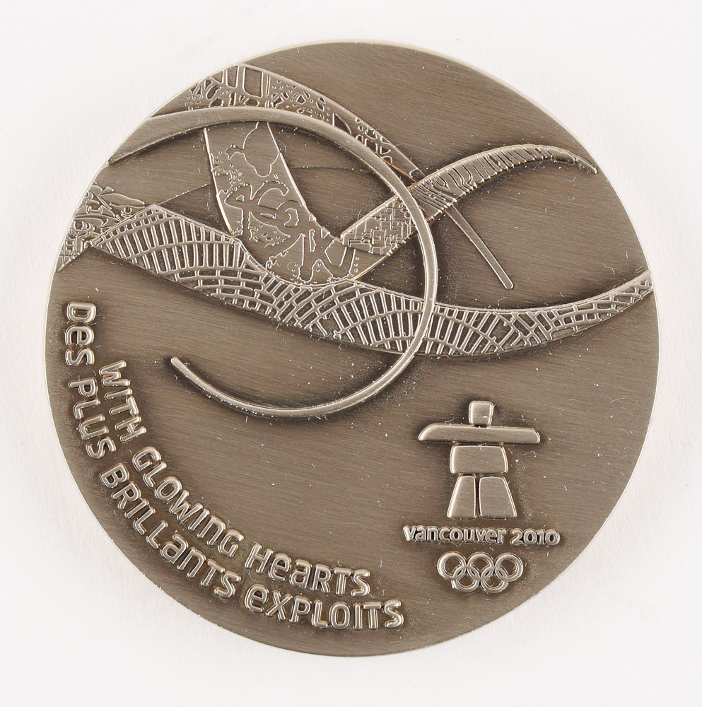 Attractive participation medal issued for the Vancouver 2010 Winter Olympics. Silvered, 60 mm, 89 gm. The front depicts a unique orca design and the Olympic rings; the reverse bears the Winter Games emblem, graphics inspired by Canada's natural and cultural diversity, and a raised motto, "With glowing hearts, des plus brillants exploits." Complete with original case.