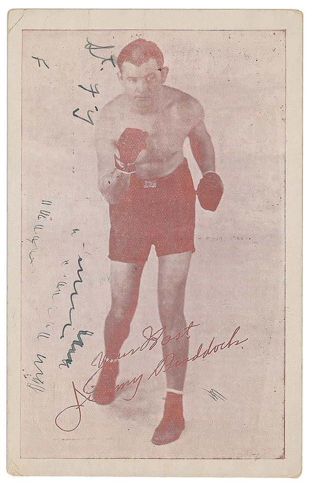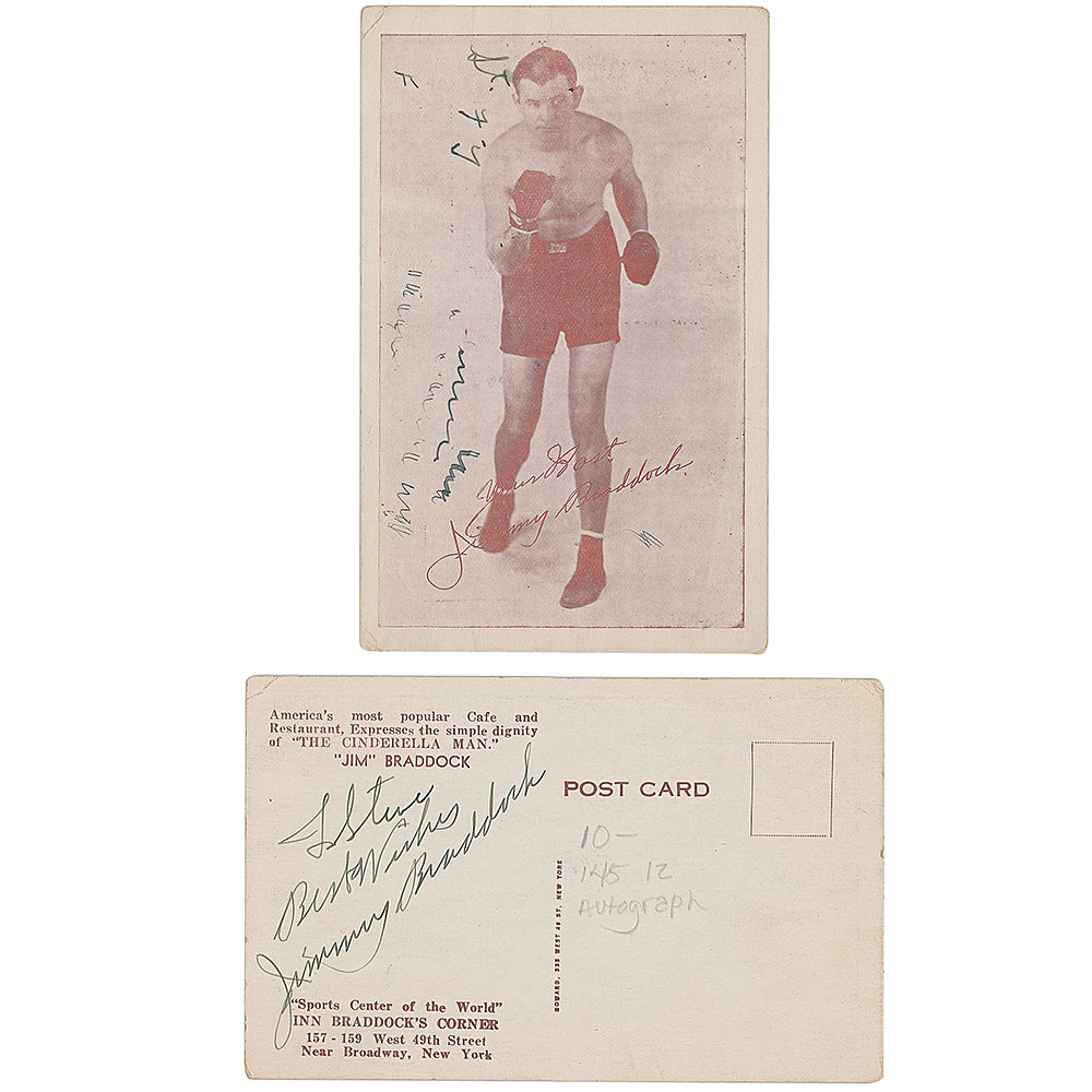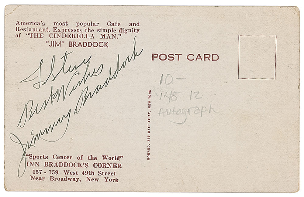 Postcard for the "Inn Braddock's Corner" restaurant in NYC, 3.5 x 5.5, featuring a full-length boxing portrait of the 'Cinderella Man' on the front, signed and inscribed on the reverse in fountain pen, "To Steve, Best Wishes, Jimmy Braddock." The front bears a preprinted facsimile signature. In fine condition, with random scribbles in an unknown hand on the photo side.