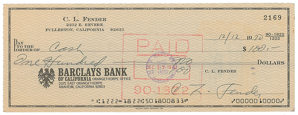 American inventor (1909-1991) who founded Fender Electric Instrument Manufacturing Company, and is remembered for designing the Telecaster, Stratocaster, and Precision Bass. Personal check, 8.25 x 3, filled out and signed by Fender, "C. L. Fender," payable to cash for $100, December 12, 1970. In fine condition.