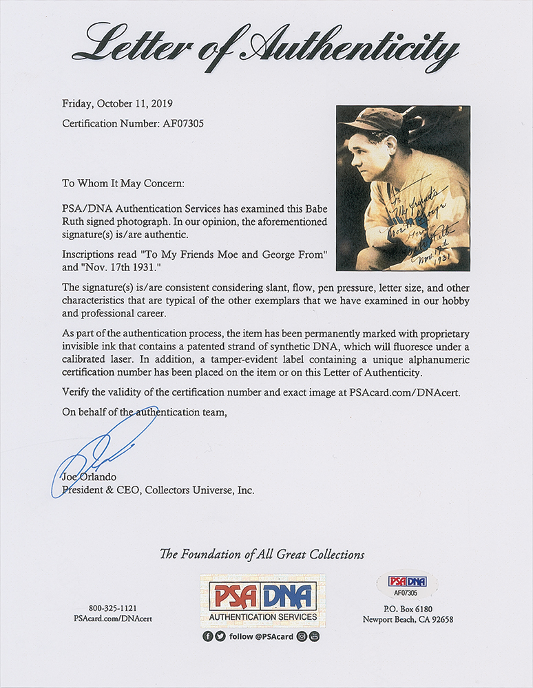 George Burke’s photos are of the utmost desirability among collectors—he is universally acknowledged as one of the greatest baseball photographers of his day, with many of his images being used in the iconic Goudey baseball card sets of the early 1930s. Boasting incredible image clarity and a superb association with Ruth's famous rags-to-riches tale, this is an impeccable signed photograph and an ideal representation of the legendary ballplayer. Accompanied by a full letter of authenticity from PSA/DNA. Pre-certified Beckett Authentication.