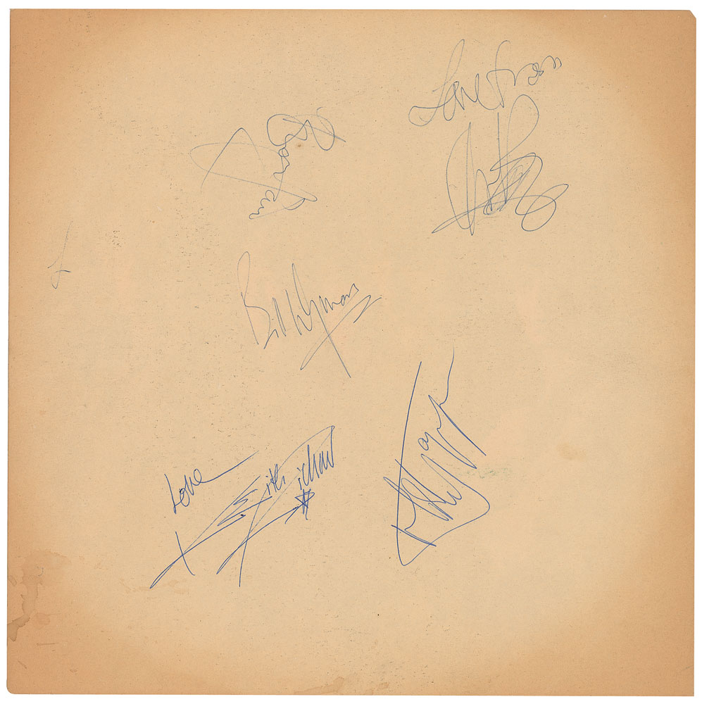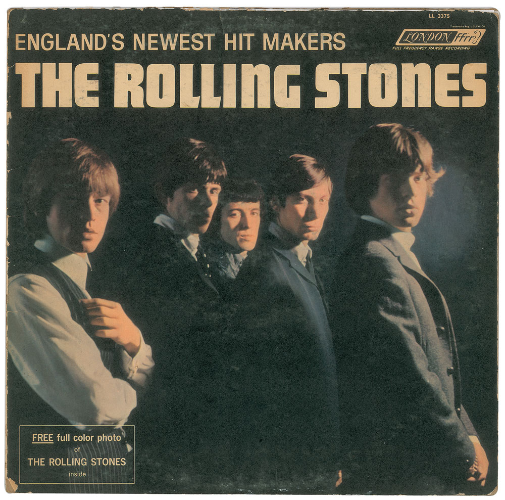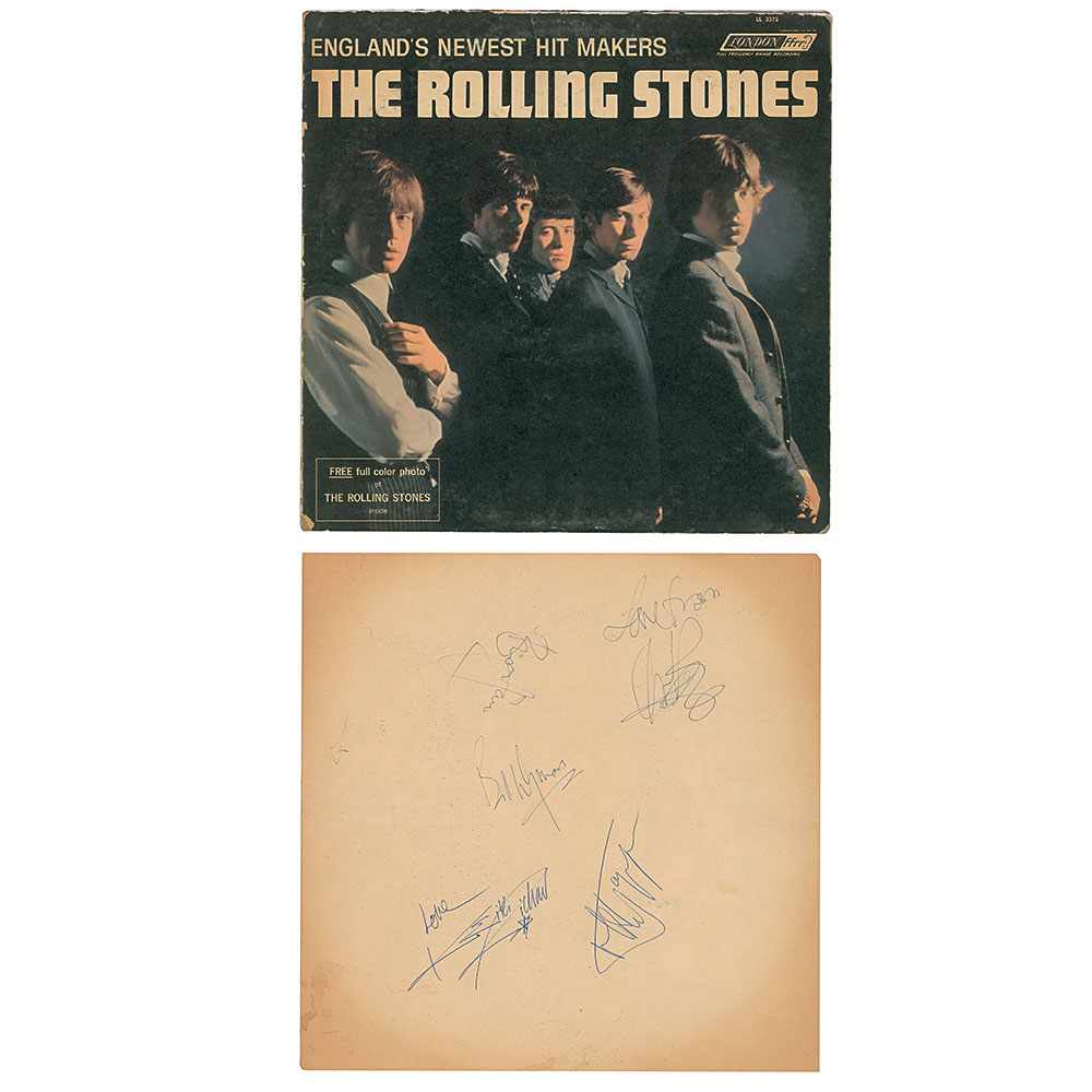 London Records American debut album from the Rolling Stones, England's Newest Hit Makers, signed on the reverse of the album insert in blue and black ballpoint, "Brian Jones," "Love, Keith Richard," "Mick Jagger," "Love from Charlie Boy," and "Bill Wyman." In very good to fine condition, with light toning and staining to the edges of the signed insert, and light scuffing, edge wear, and edge separations to the album sleeve. The record is included. Consignor notes that she was given 'this album 40 years ago' after her sister obtained the autographs from the Loews Regency Hotel in New York City when the band were on their first American Tour; the Stones played two shows at Carnegie Hall on June 20, 1964.