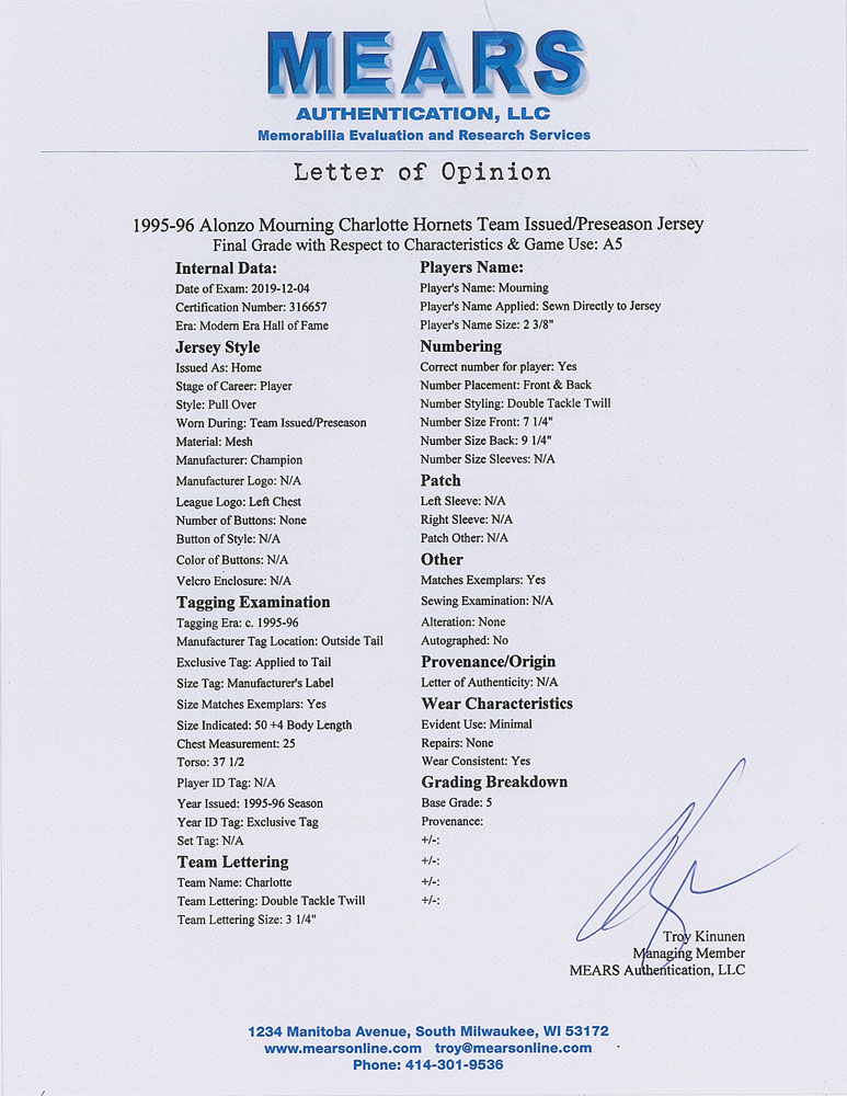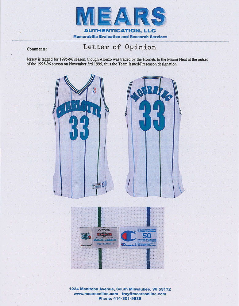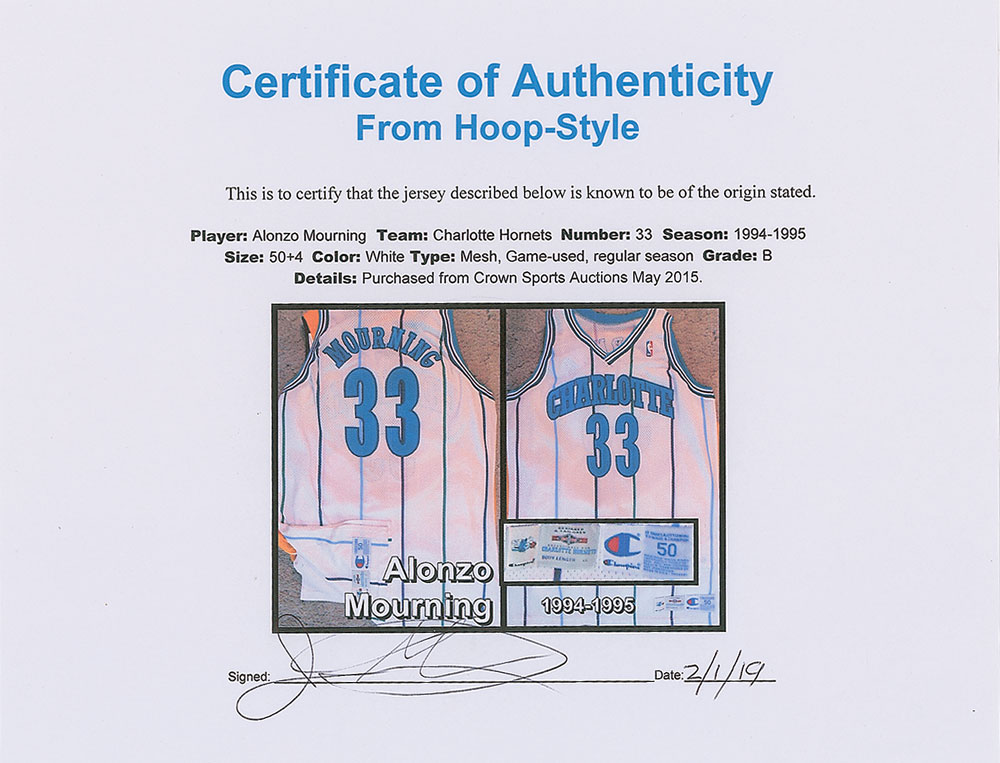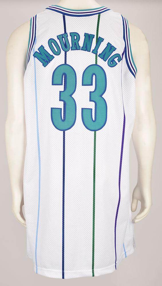 Alonzo Mourning's game-used Charlotte Hornets pinstriped away jersey from the 1994-95 season. The mesh jersey features "Charlotte" and his number "33" on the front, and "Mourning" and "33" on the back. The front tail has the Champion tag indicating size 50, and Charlotte Hornets tag noting alterations, "Body Length +4." In fine condition.