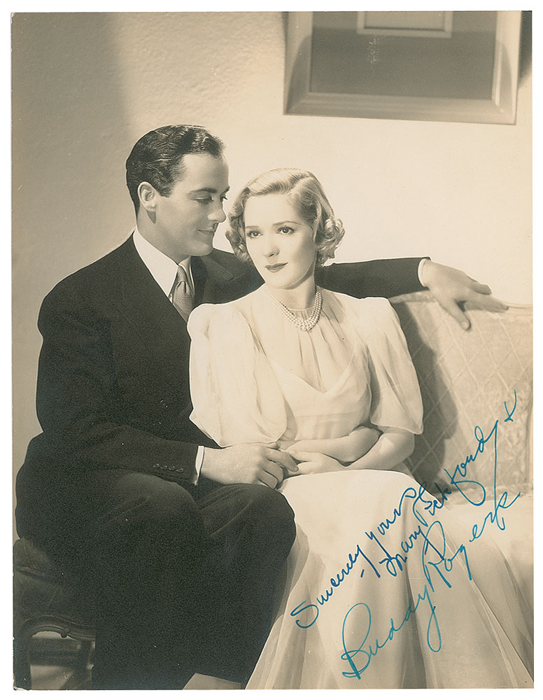 Vintage matte-finish 6.5 x 8.5 photo of the longtime Hollywood couple, signed in blue fountain pen, "Sincerely yours, Mary Pickford &" and "Buddy Rogers." In fine condition, with trimmed edges, and a light paperclip impression to the top edge. Pickford and Rogers were married for 42 years until the former's passing in 1979.