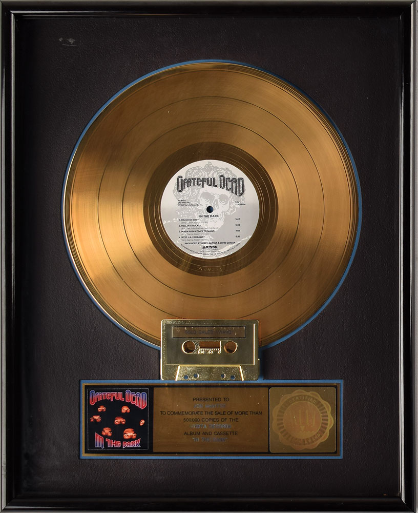 Official RIAA flower hologram-style gold sales award presented "to Jon McIntire to commemorate the sale of more than 500,000 copies of the Arista Records album and cassette 'In the Dark.'" Framed with its disc, cassette, plate, and small album cover image to an overall size of 17 x 21. In fine condition. Includes a laminated 'Access All Areas' guest pass for the Grateful Dead's 1991 Spring Tour, with reverse issued to Jon McIntire.