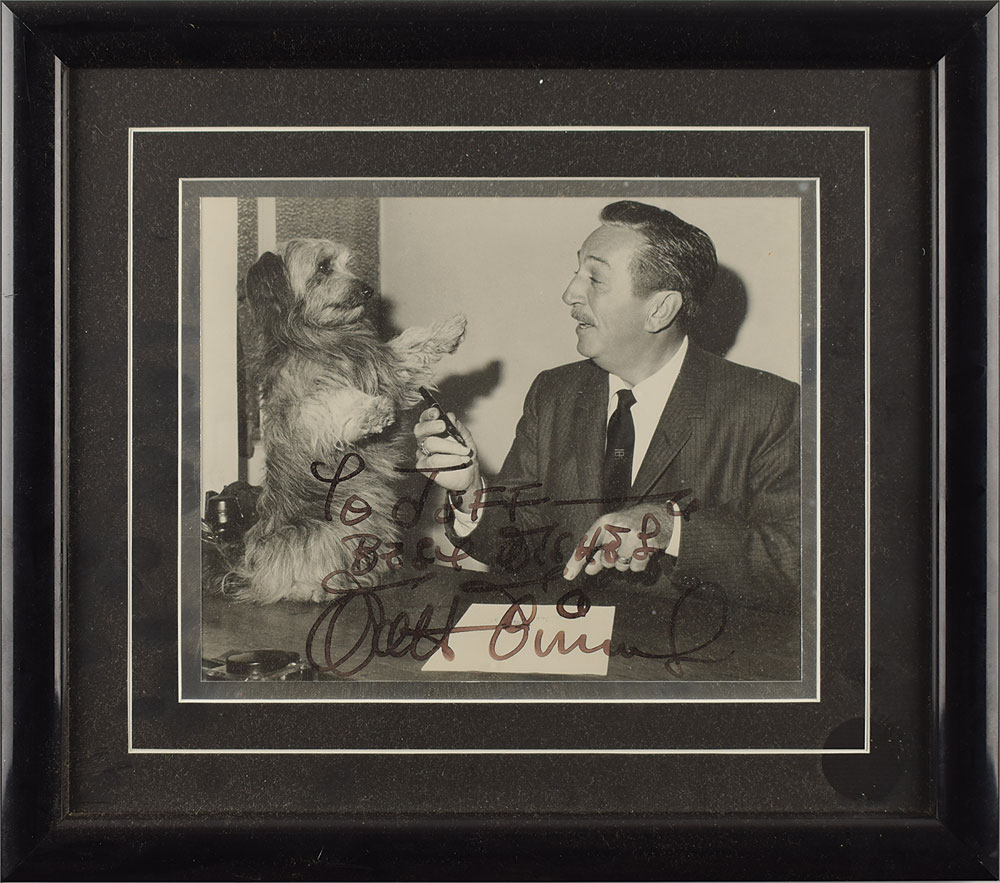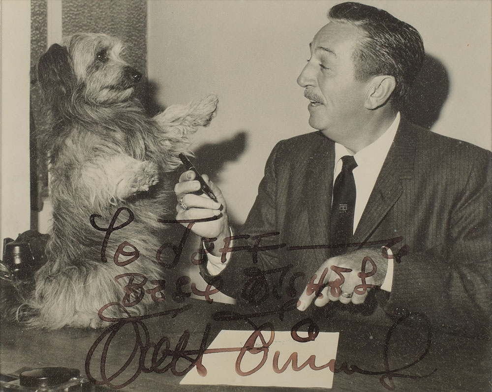 Wonderful vintage matte-finish 9 x 7.25 photo of Disney offering a pen to a well-trained Skye Terrier, the star of the 1961 film Greyfriars Bobby, signed and inscribed in black felt tip, "To Jeff, Best wishes, Walt Disney.” Double-matted and framed to an overall size of 15 x 13.25. In fine condition. Robert Westerby's screenplay for Greyfriars Bobby was based upon a 1912 novel of the same name by Eleanor Atkinson, which, in turn, was inspired by an incident involving a Skye Terrier who became known in 19th-century Edinburgh for guarding the grave of his owner for 14 years.