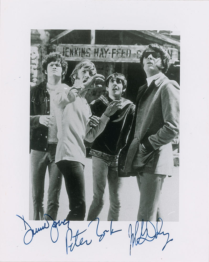 Glossy 8 x 10 photo of the Monkees from one of their television episodes, signed in black ink by Davy Jones, Micky Dolenz, and Peter Tork. In fine condition.