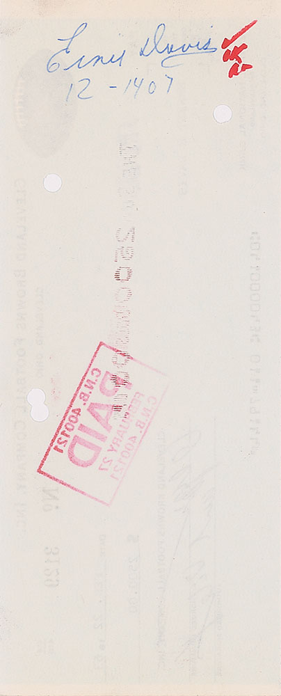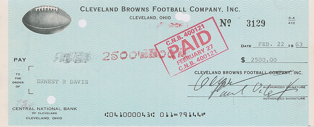 Cleveland Browns Football Company check, 8.5 x 3.5, filled out in type and made payable to Ernest R. Davis for $2500, February 22, 1963. Endorsed on the reverse in blue ballpoint, "Ernie Davis." In fine condition, with several cancellation punch holes. Davis was drafted with the No. 1 overall pick in the 1962 NFL draft and immediately traded to the Cleveland Browns, signing a three-year contract for $200,000 in late December 1961. Less than three months after endorsing this check, Davis succumbed to leukemia at the of age 23. Only the second signed check from Davis that we have offered. Accompanied by a full letter of authenticity from PSA/DNA.
