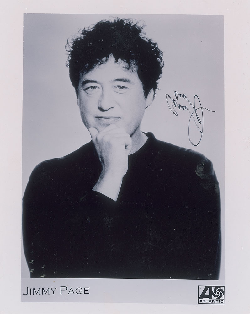 Glossy 8 x 10 Atlantic Records publicity photo of Jimmy Page, signed in black felt tip. In very good to fine condition, with scattered light creasing and surface impressions, and a diagonal crease to the upper right background.