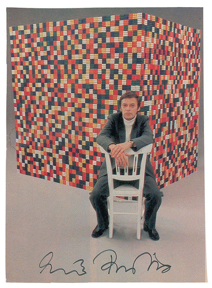Hungarian inventor, architect and professor of architecture (born 1944) who is best known for the invention of mechanical puzzles such as the Rubik's Cube, which is widely considered to be the world's best-selling toy. Color 4.75 x 6.5 magazine photo of Erno Rubik seated in front of giant version of his popular 3-D combination puzzle, signed in black felt tip. In fine condition.