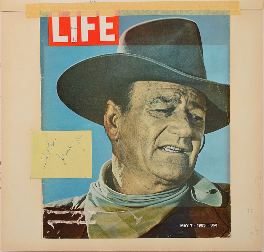 Vintage fountain pen signature and inscription, "To Bob, John Wayne,” on an off-white 3.25 x 2.75 sheet affixed to a large color photo of Wayne from one of his Western films. Matted to an overall size of 15 x 13.75. In fine condition.