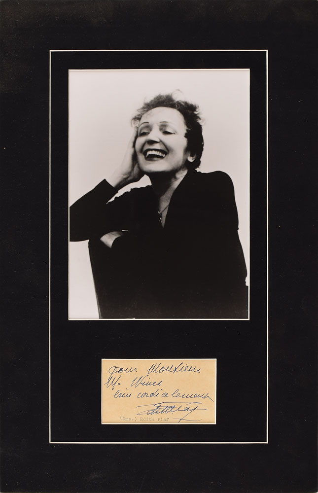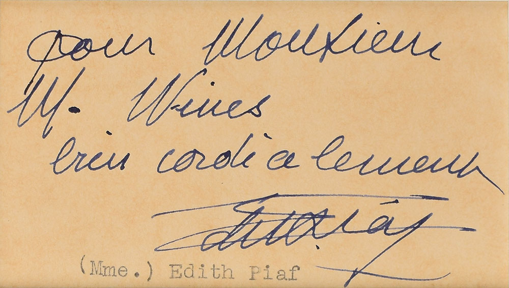 Vintage ink signature and inscription in French, "Pour Monsieur M. Wives?Edith Piaf,” on an off-white 3.75 x 2 card. Suede-matted with a photo of the singer to an overall size of 11 x 17. In fine condition.