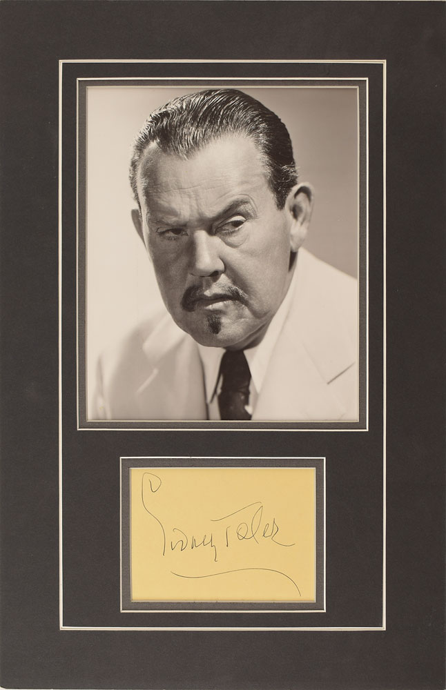 Uncommon vintage ink signature, "Sidney Toler,” on a light yellow 4.5 x 3.25 album page. Double-matted with a photo of Toler as Charlie Chan to an overall size of 11 x 17. In fine condition.