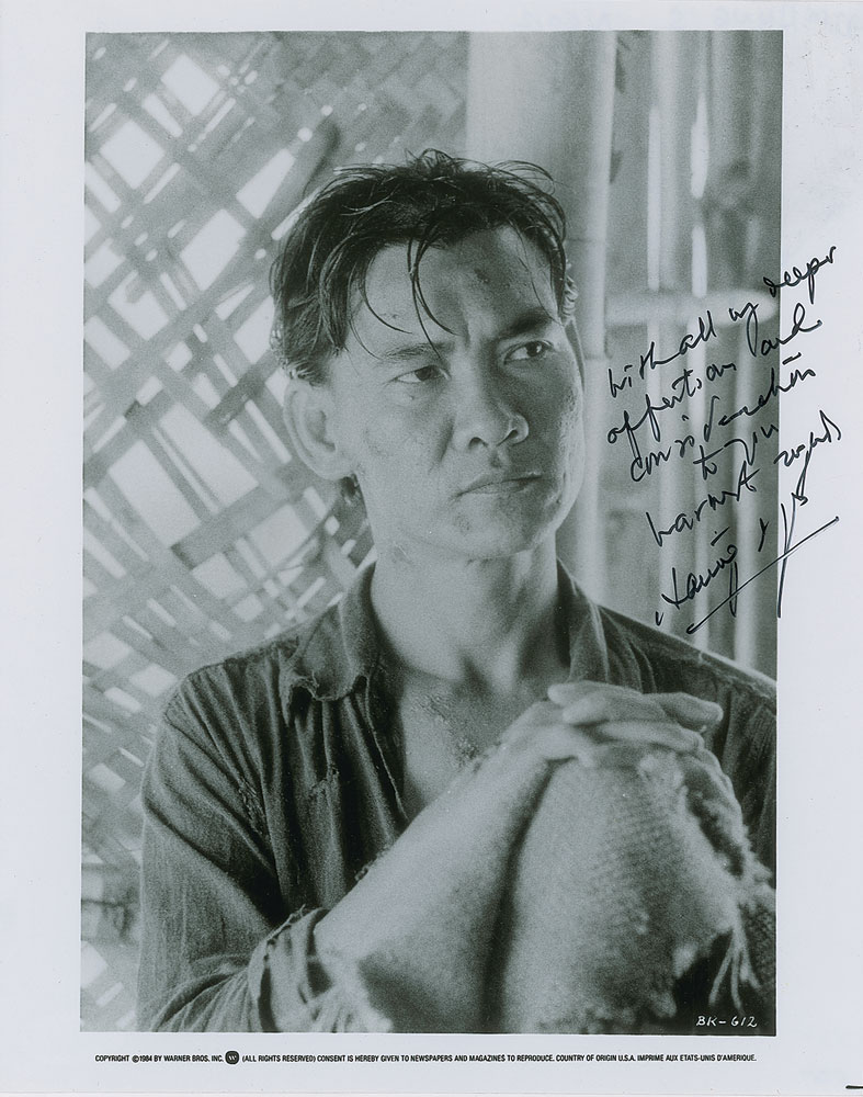 Cambodian-American actor, author, and refugee (1940-1996) who is best remembered for winning the Best Supporting Actor Oscar in 1985, distinguishing Ngor as the first and only man of Asian descent to ever win the award. Ngor and Harold Russell are the only two nonprofessional actors to win an Academy Award in an acting category. Glossy 8 x 10 Warner Bros. publicity photo of Ngor in his Oscar-winning role as Dith Pran in The Killing Fields, signed and inscribed in black felt tip, "With all my deep affection and consideration to you, warmest regards, Haing S. Ngor.” In very fine condition, with a JSA label affixed to the reverse. Accompanied by a certificate of authenticity from JSA.